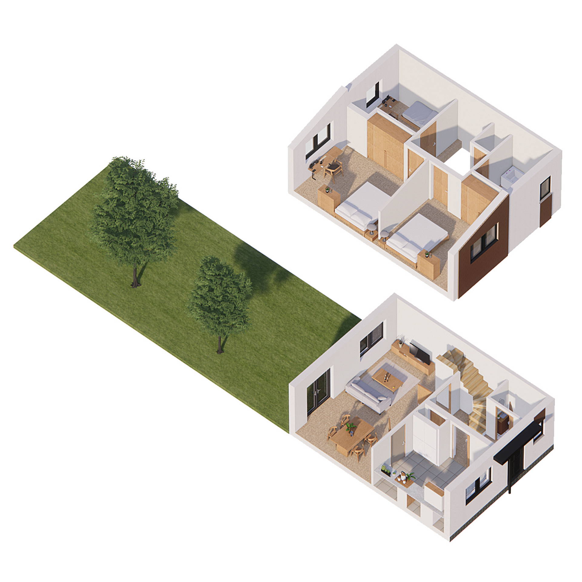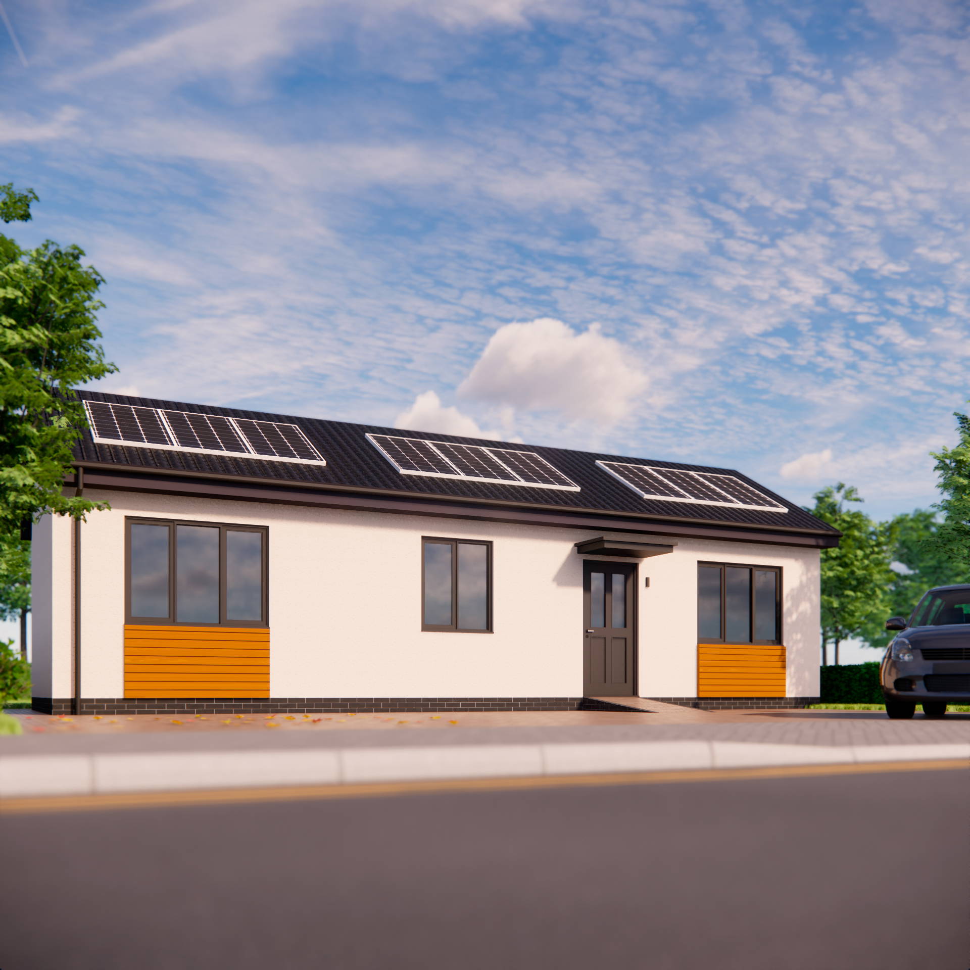 Standard bungalow plans are available as 1 double bedroom or 2 double bedroom modules. Houses are available with plans from 2 bed/4 person up to 5 bed/8 person. With the addition of optional ‘Room in Roof’ for 3, 4 and 5 bedroom plans, our houses can provide a mix of housing options suited to most developments. A typical 3 bed home provides 93m2 of living space.