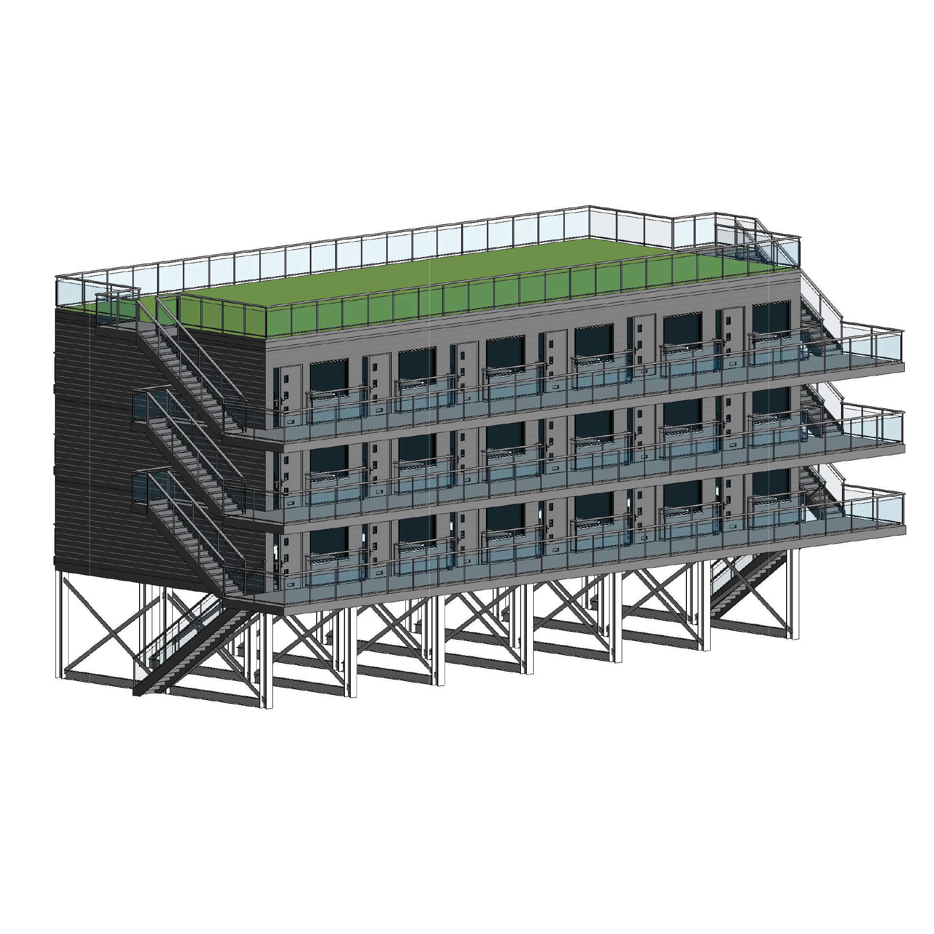 Our modules are engineered to be capable of stacking up to 6 units high (18m). This low-rise apartment system uses a range of predetermined building styles, creating a mix of apartments within a block and intended primarily for affordable and rented accommodation. Please contact us for more information on the options available.
